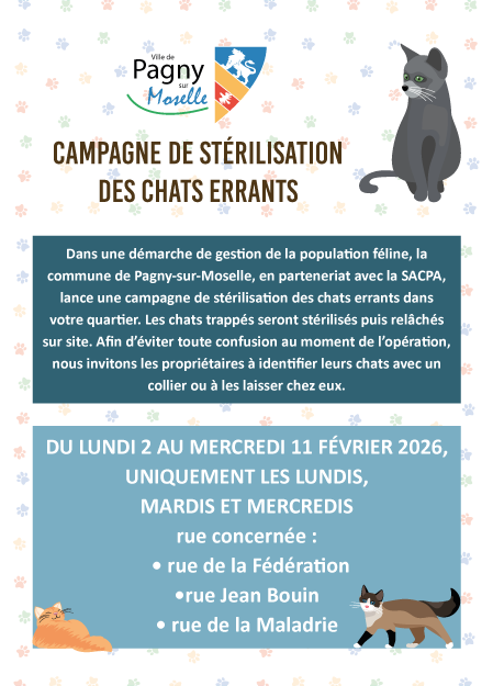 Dans le cadre de la gestion de la population féline, la commune, en partenariat avec la SACPA, lance une campagne de stérilisation des chats errants