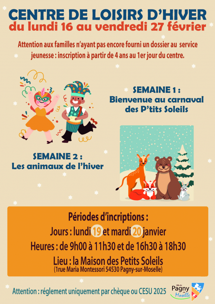 Un centre de loisirs de proximitéChaque période de vacances scolaires (hors congés de Noël), le centre de loisirs la maison des P’tits Soleils est organisé dans les locaux situés 1 rue Maria Montessori 54530 Pagny-sur-Moselle. Les directeurs du centre sont :