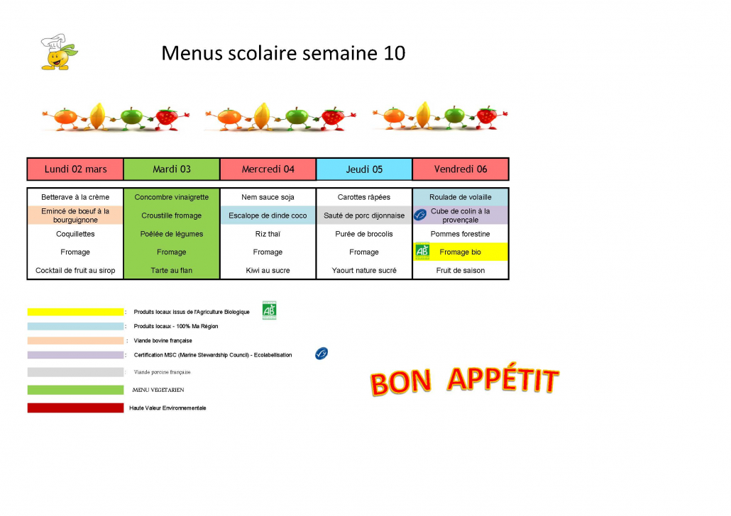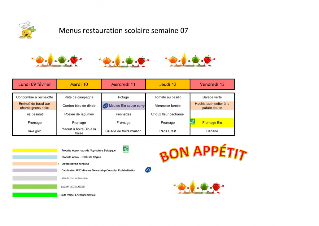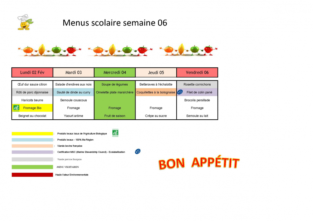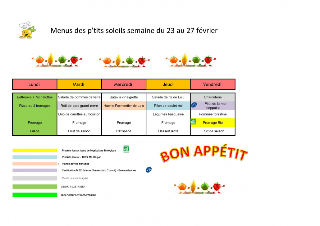 Vous trouverez ci-dessous les menus de ces prochaines semaines