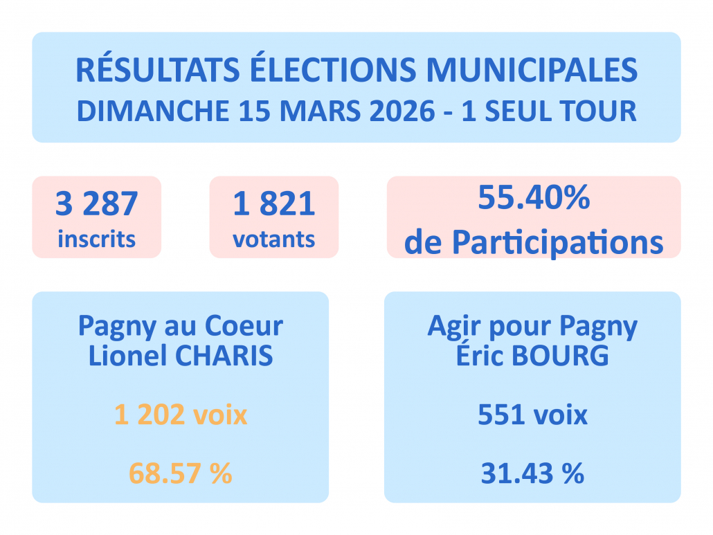 | Les élections municipales se sont tenues le dimanche 15 mars 2026 à Pagny. À l’issue du dépouillement des trois bureaux de vote de la commune, les résultats suivants ont été établis. |