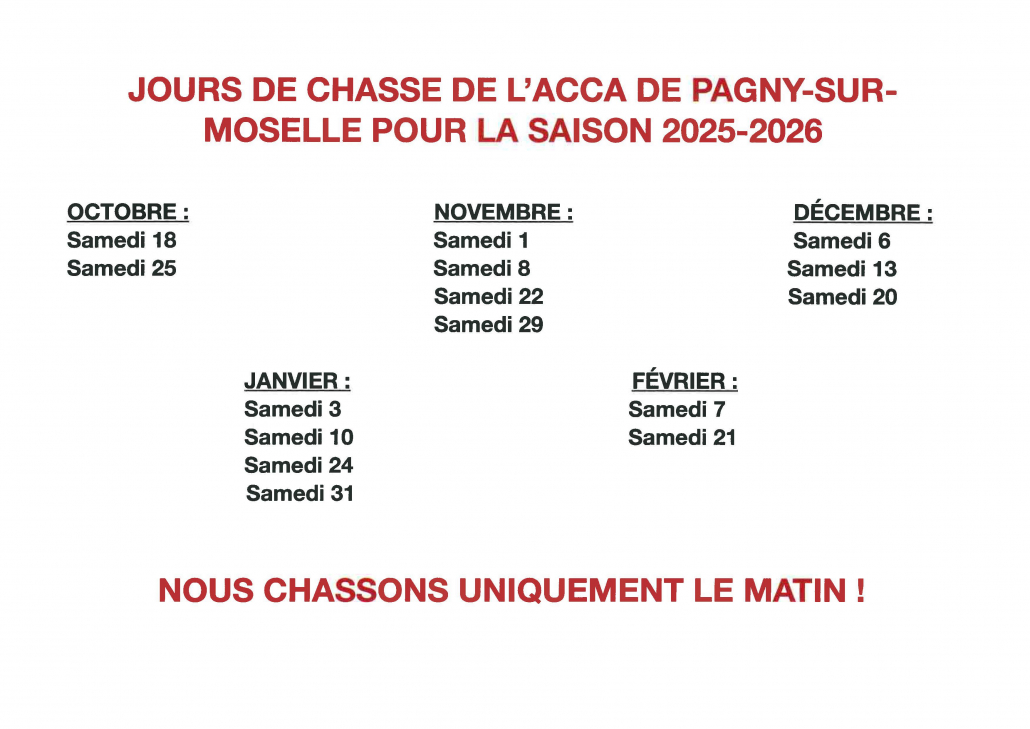 L’Association de Communale de Chassse Agréée de Pagny-sur-Moselle informe les habitants que la chasse aura lieu les :