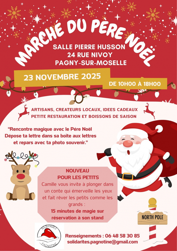 📅 Le dimanche 23 novembre 2025, la Salle Pierre Husson, située 24 rue Nivoy à Pagny-sur-Moselle, ouvrira ses portes de 10h à 18h pour accueillir petits et grands dans une ambiance féérique. ✨ Cet événement, organisé par l’association Solidarités Pagnotine ❤️, promet une journée placée sous le signe de la convivialité, du partage et de la magie de Noël. 🎄🎁