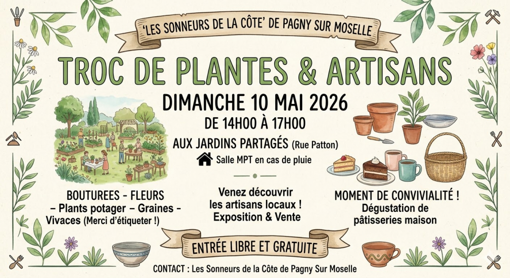 L’association Les Sonneurs de la Côte de Pagny-sur-Moselle vous invite à participer à un moment convivial autour du partage et de la nature à l’occasion d’un troc de plantes et d’une rencontre avec des artisans locaux.